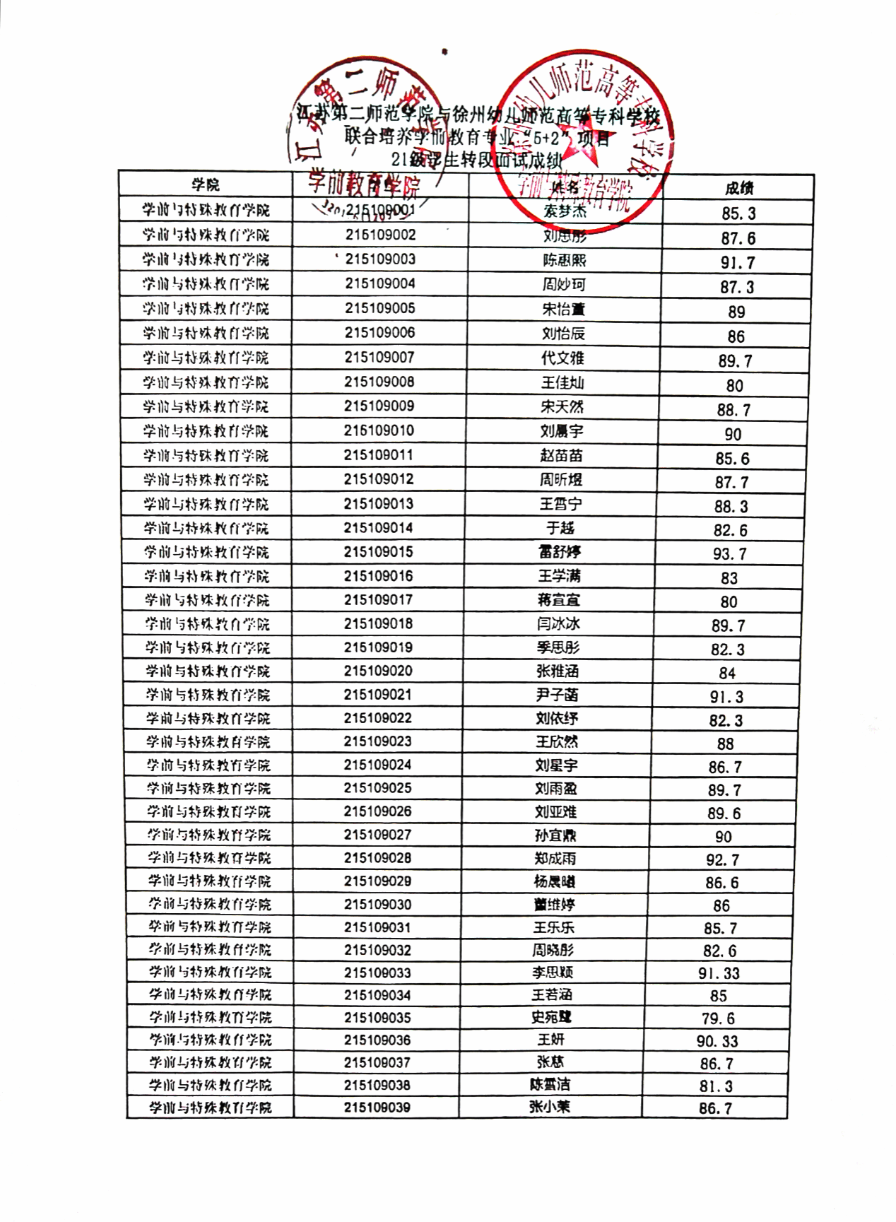 依据《江苏第二师范学院学前教育专业“5+2”分段培养转段升学考核方案》和《江苏第二师范学院学前教育专业“5+2”分段培养项目21级学生转段升学考核实施方案》精神,我院2021级学前教育专业“5+2”项目学生转段面试于4月2日进行。现将面试成绩予以公示,公示时间为2026年4月3日至2026年4月8日。