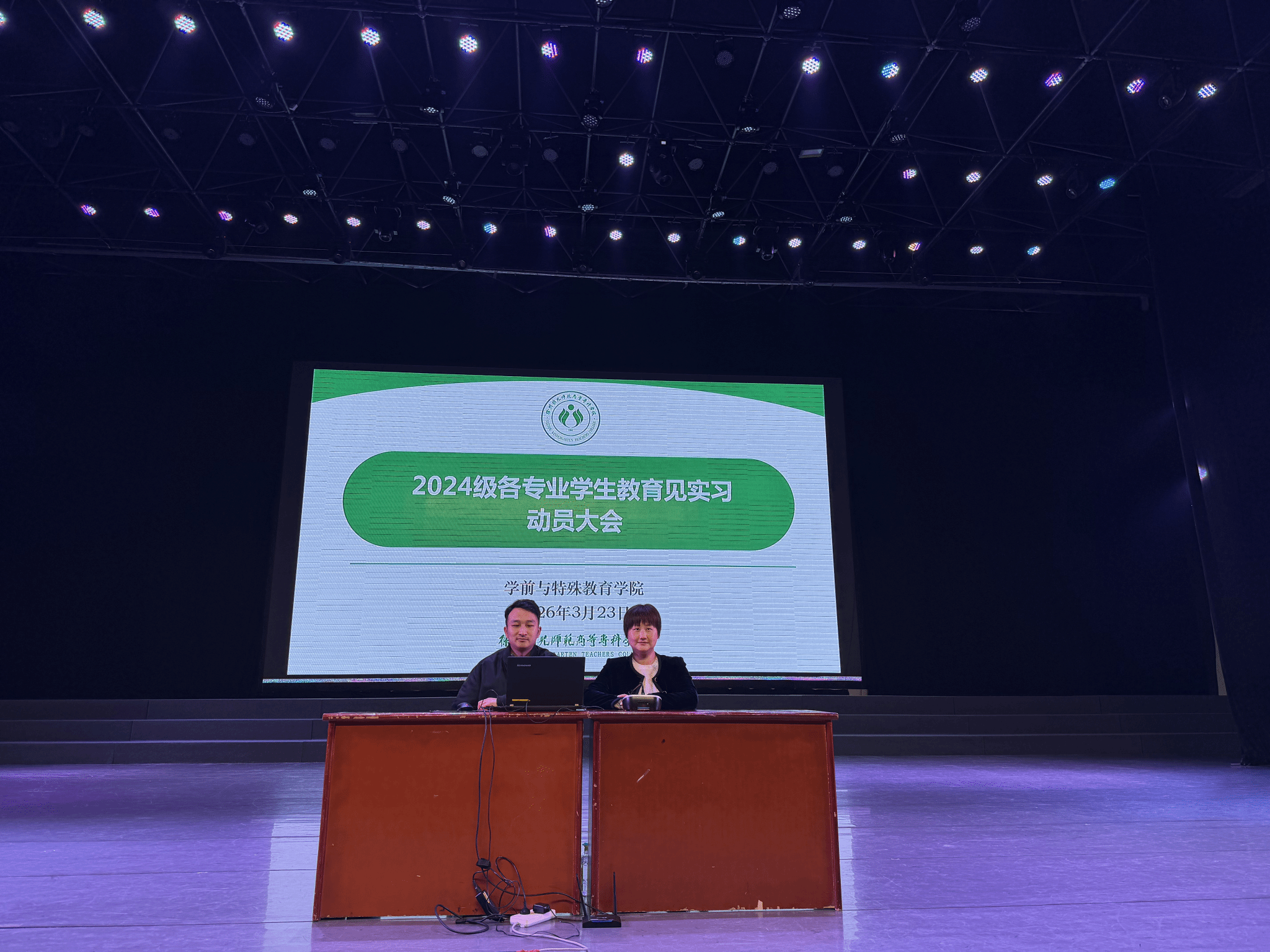 为扎实推进教育见实习各项工作落地见效,引导全体学生明晰实践目标、严守纪律规范、筑牢安全防线,我院于3月23日下午在洞山校区演播厅召开教育见实习动员大会。副院长陆珊珊出席会议,学前教育、早期教育、婴幼儿托育服务与管理等专业学生参加会议,会议由特殊教育教研室主任苏晗主持。
