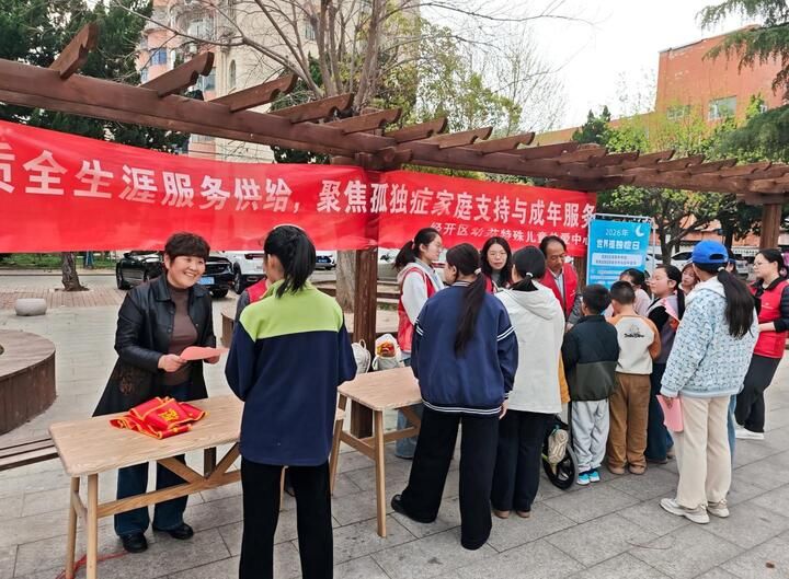 当日下午,支部带领学生志愿服务队走进经开区金苑社区,通过发放资料、现场答疑、互动游戏等方式,纠正“孤独症是内向”“长大就好”等常见误区,社区工作人员协同配合,打造家门口的科普课堂,让包容理念深入人心。