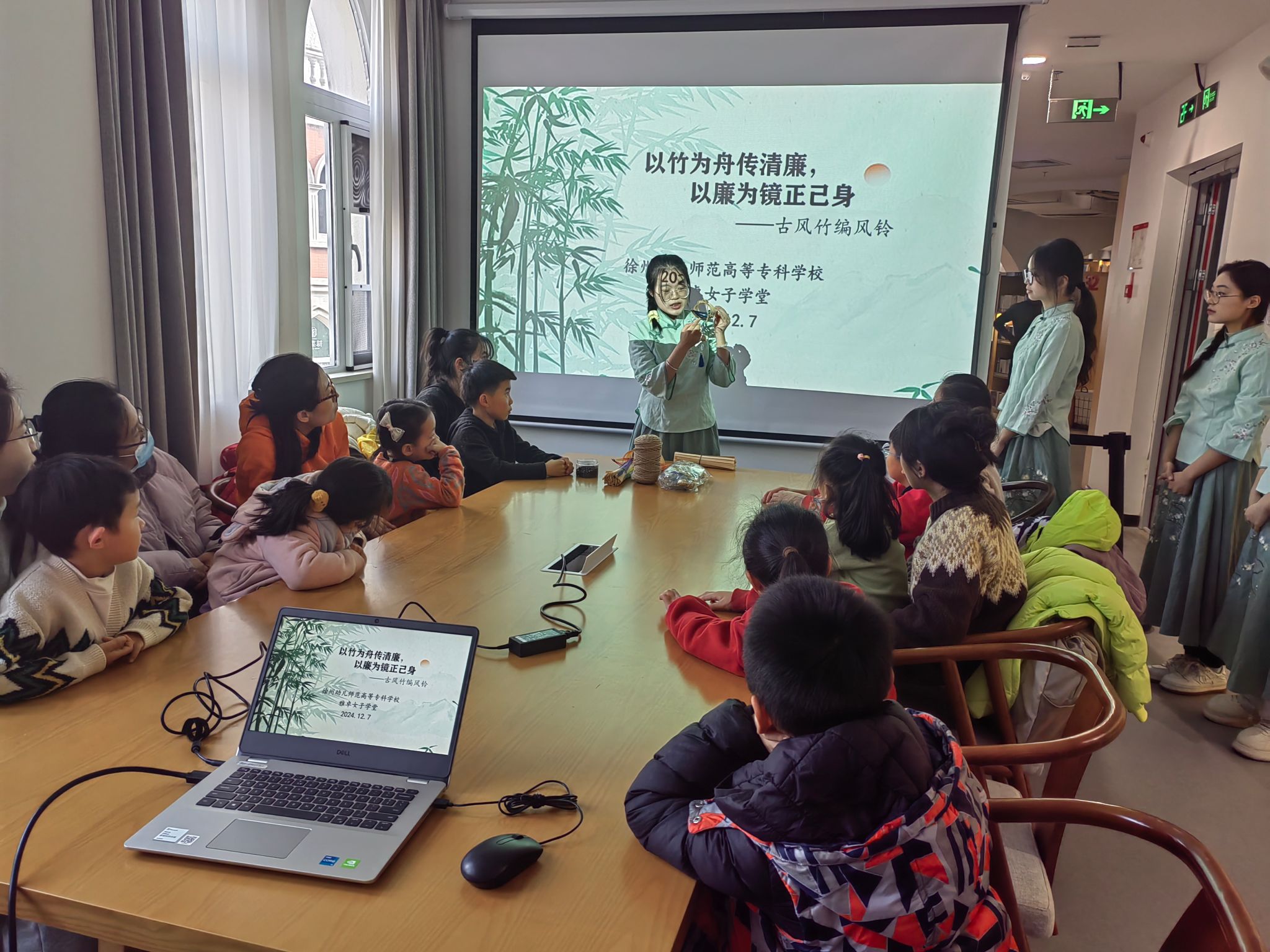 竹在中国传统文化中具有特殊的意义,其生而有节,虽清瘦却挺拔,风过不折,雨过不浊,象征着清廉正直、守律自律的品质。12月6日,雅卓女子学堂的学员们,在指导老师盖爽的带领下,来到徐州经济技术开发区图书馆,面向15个家庭开展了“以竹为舟传清廉 以廉为镜正己身”为主题的非遗竹编风铃活动。